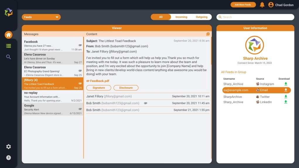 Sharp Archive is a Gmail backup tool that captures all types of Gmail account content, such as Inbox, Sent, Deleted, Spam and Trash Mail in real-time. It presents the content in a natural format that mimics the look and feel of an email account, allowing for easy searching and filtering of single, group, or all accounts by incoming, outgoing, or all messages. The Gmail inbox archiving tool also allows users to download any content at any time without any additional fees. It is useful for various industries that require Gmail backups. This ensures that you have a secure and easily accessible copy of your data.